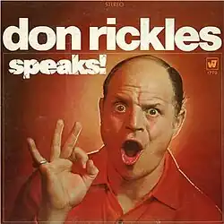 Don Rickles Speaks! is a comedy album released in 1969 by Don Rickles. It begins with an introduction by G. Bernard Owens who tells the audience that the recording they are about to hear reveals the serious side of Rickles and his "thoughts of people, life, philosophy." Immediately after the introduction, we hear laughter, which completely contradicts what was heard previously. In the album, Rickles is interviewed by a panel of "eminent experts" who ask him about celebrities such as Dean Martin, Johnny Carson, Kirk Douglas, Robert Goulet, and Frank Sinatra, as well as such music acts as The Electric Prunes and Snooky Lanson.