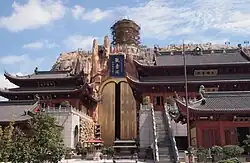 In the back of the courtyard lies, the main building of the temple, the Guanyin Dian. The hall's exterior mimics a large red natural cliff. The entrance gate to the building is about 20 meters high and 10 meters wide. Its bronze doors are decorated with 999 relief images of Buddha.[2] The hall is 31 meters wide, 42 meters deep, and 31 meters high[2] and houses a gilded statue of the thousand-armed Guanyin. The statue is 27 meters tall and stands on a 2-meter-high lotus base.[2] Its arms are up to 5 meters in length.[2]