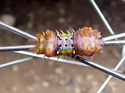 The caterpillars of D. vulnerans are only about 2 cm long.[7] They are distinctively banded with different colours, considered as an evolutionary means of displaying its dangerousness (a phenomenon called aposematism).[8] They are broad, thick and short. There are four reddish and spiny projections on the anterior and posterior ends. The anterior end can be distinguished by its stouter appearance and the presence of a pair of tiny and reddish spine (antennae) compared to the posterior end that bears two slender but elongated whitish tails.[6] The eight projections can pop up about a hundred of yellow needle-like stinging hairs or spines.[9]
