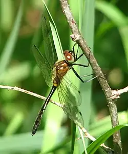 Dorocordulia libera is a metallic green, slender dragonfly with brown hair, black legs, and clear wings.[2]
