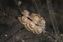 The body of this nudibranch is translucent white with pink ovotestis visible in mature individuals. There is a longitudinal stripe of brown pigment along the midline of the back which bifurcates on the head and leads to the brown rhinophores. The cerata are distinctive in shape, without tubercles but with a series of raised rings on their outer faces. They have bushy white pseudobranchs on the inner faces and the raised rings have brown lines at their apices, edged by orange. The maximum length of this species is 15 mm.[1]