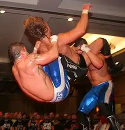Two wrestlers throw a single opponent up into a flapjack. In this move both wrestlers push the opponent upward by reaching under their legs and lifting them into the air. While keeping the hold on the opponent’s legs the wrestlers fall backwards, dropping the opponent front-first into the canvas. Another basic double flapjack is similar to a back drop, in which the wrestlers push the opponent upwards and release them so that they fall onto their face instead of falling back-first.