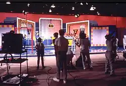 A weekend edition titled Super Sloppy Double Dare taped over two weeks in July 1987 and premiered August 2, 1987, airing 26 episodes on Sunday mornings.[36][37][38] Super Sloppy Double Dare featured gameplay identical to the original format; however, physical challenges and obstacles were designed to make a bigger mess. Viewers were encouraged to send in a postcard with their contact information and could win a prize if their card was selected, and a team performing a physical challenge completed the stunt successfully.[39] Episodes of Super Sloppy Double Dare were taped at Unitel Studio in New York City before production moved back to WHYY-TV.[40][41]