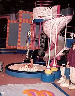Many obstacles have appeared in the course rotation, often based on body parts, food, and enlarged items found in daily life.[14] Popular elements of the obstacle course have included The One-Ton Human Hamster Wheel, an oversized hamster wheel; Pick It, a giant human nose with a flag hidden inside; The Sundae Slide, a chocolate-covered ramp leading to a playground slide with ice cream at the bottom; and Gum Drop, which required contestants to leap into a giant gumball machine filled with plastic balls and slide out through the dispensing hatch at the bottom.[14][15]