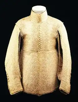 In 1536, the embroiderer William Ibgrave fashioned the initials of Jane Seymour with pearls and emeralds to decorate a doublet for Henry VIII.[9] He was paid for pinking and cutting the doublets of Edward VI in 1553.[10] In the early Elizabethan period, doublets for men were padded over the belly with bombast in a "pouter pigeon" or "peascod" silhouette.[11] Sleeve attachments at the shoulder were disguised by decorative wings, tabs, or piccadills, and short skirt-like peplums or piccadills covered the waist of the hose or breeches. Padding gradually fell out of fashion again, and the doublet became close-fitting with a deep V-waistline.