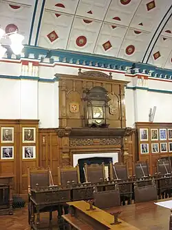 The design involved an asymmetrical main frontage of 11 bays facing onto Ridgeway Street. The left-hand section of four bays formed the public library: the fourth bay on the left featured a round headed opening with an open segmental pediment. The other bays were fenestrated with round headed windows on the ground floor and with sash windows on the first floor. The first two bays were surmounted by a gable containing an oculus. The right-hand section of seven bays formed the town hall: the third bay on the right featured a round headed opening with a triangular pediment. The other bays were fenestrated with sash windows on both floors and the first four bays on the left of the town hall section were surmounted by a gable. Internally, the principal rooms were the offices of the council officers on the ground floor and the council chamber, which was 47 feet (14 m) long and 32 feet (9.8 m) wide, on the first floor. The council chamber was panelled and featured an ornate arched ceiling designed by Warings of London.[6]