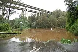 At this location also are the Douglas Park twin bridges, carrying northbound and southbound lanes of the F5 Freeway over the Nepean River. This bridge was opened in 1980, as part of the extension of the Hume Highway from Campbelltown to Yanderra.[18] In 2007, Douglas Park residents expressed concern that coal-mining in the area would cause the collapse of either or both of these bridges, possibly resulting in many deaths.[19]