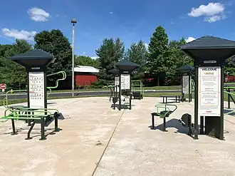 Doylestown Central park has several fitness stations installed around the park along the walking trail. Weather permitting, outdoor boot camp classes are hosted on Monday and Wednesday evenings from 6:00-7:00pm.[11]