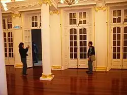 Internally, the Hall is richly decorated with classical architectural features in the Baroque and Rococo styles: a grand staircase with carved wooden railings and ornamental balustrading runs from the basement to the second floor, the ceilings of the main rooms are ornately adorned with moulded plaster panels highlighted in gold leaf, while colourful stained-glass windows presenting Art Nouveau patterns of the period can be found along the main staircase and in other prominent locations.[3][8] The Hall also features crystal chandeliers and wall lamps, hardwood wainscoting panels, fireplaces, patterned floor tiles, glazed wall tiles, and wooden louvre windows. The Hall also has a very deep veranda, which is a typical colonial building design used to regulate the climate in all seasons.[3] The stained-glass windows, veranda, wall tiles, and staircase railings are all preserved intact.[1] Inside the Hall are two flights of staircases, one at the front for use by the Ho family, and one at the back for use by mui tsai (maids). This feature reflects the idea of social stratification in Chinese societies.[3]