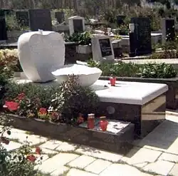 On the day of the concert, the band members and their small entourage left Sarajevo on their way to Mostar in three cars: vocalist and guitarist Ričl, guitarist Arslanagić, and bass guitarist Buha were in Arslanagić's Zastava 750, keyboardist Žerić and drummer Jelčić were in Žerić's Volkswagen Golf Mk1, while employees of the Zenica-based Atlas company, the organizers of the tour, were in a Zastava 1500.[14] On a single-lane bidirectional road next to the Neretva river near the town of Jablanica, the Zastava 750 driven by Arslanagić veered into oncoming traffic colliding head-on with a truck.[14] Buha died on the spot due to severe injuries,[4] while Arslanagić and Ričl were transferred to Mostar city hospital, with hundreds of the city's young people gathering in front of the hospital offering to donate blood.[4] During the following several days, Arslanagić managed to recover, while the condition of Ričl, who had suffered severe head injuries, got progressively worse.[4] He was transferred to Military Medical Academy in Belgrade by helicopter, but the Academy's staff could do little to help.[4] He died on 1 October 1986, aged 24.[4] He was buried in the Bare Cemetery in Sarajevo. The three surviving members of Crvena Jabuka decided to continue their activity, dedicating their next release, the 1987 album Za sve ove godine (For All These Years) to Ričl and Buha.[4]