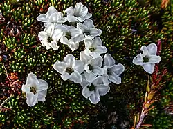 Dracophyllum minimum is a highly compacted cushion plant that grows close to the ground. It can form a large spreading mat, often interspersed with other cushion plant species such as Oreobolus pumilio, Abrotanella forsteroides, Donatia novae-zelandiae and Mitrasacme archeri. This undulating mat of mixed species is referred to as mosaic cushion heath.[4] The leaves of D. minimum are bright green and sessile, with reddish tips and a broad sheathing base as long as the blade, approx 3 to 4 mm (0.12 to 0.16 in).[4] The flowers are small, solitary, white, and tubular, sitting directly on top of the foliage.[5] The plant can often be mistaken for the vegetatively similar cushion plants Abrotanella forsterioides and Donatia novae-zelandieae, however D. minimum is distinguished by its lack of a hairpoint on the leaf tip or hairy leaf axils.[6] Cuchion plants are extremely slow growing and can occupy sites for a long period of time.[7]