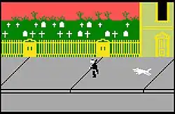 Dracula can be played as a single-player game, or two players taking turns. In the single-player game, the player takes on the role of Dracula as he attempts to bite an allotted amount of victims such as joggers and other neighbours to maintain his strength between midnight and 6:00 am.[2] Dracula is moved by the disc controller.[3] The player must avoid obstacles such as wolves, vultures and the police. Dracula has the power to turn a police officer into a zombie and attack the other police.[2]