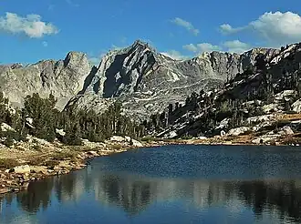 Dragon Peak is a 12,955-foot-elevation (3,949-meter) mountain summit located on the crest of the Sierra Nevada mountain range in northern California.[6] It is situated on the common border of Fresno County with Inyo County, as well as the boundary shared by John Muir Wilderness and Kings Canyon National Park. It is 10 miles (16 km) west of the community of Independence, and 1.3 miles (2.1 km) south of Black Mountain. Dragon Peak ranks as the 161st-highest summit in California.[4] Topographic relief is significant as the north aspect rises 1,900 feet (580 meters) above Dragon Lake in less than one mile. This mountain is habitat for the endangered Sierra Nevada bighorn sheep, which restricts climbing from July through December, so most ascents are made in the spring. The first ascent of the summit was made in 1920 by either Norman Clyde, or Fred Parker and J. E. Rother.[8] The John Muir Trail traverses two miles west of this peak, providing an approach option. The mountain is so named because of the shape of its outline as seen from Rae Lakes.[9]