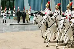 The Independence Dragoons wear 19th-century dress uniforms similar to those of the earlier Imperial Honor Guard, which are used as the regimental full dress uniform since 1927. The uniform was designed by Debret, in white and red, with plumed bronze helmets. The colors and pattern were influenced by the Austrian dragoons of the period, as the Brazilian Empress consort was also an Austrian archduchess.[39] The color of the plumes varies according to rank. The Independence Dragoons are armed with lances and sabres, the latter only for the officers and the colour guard.[40]