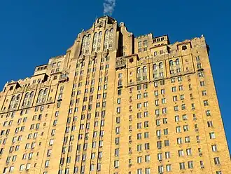 The Drake Hotel, a historic 375-foot-tall, 33-story luxury hotel located at 1512–1514 Spruce Street at the corner of S. Hicks Street between S. 15th and S. 16th Streets in the Rittenhouse Square neighborhood of Philadelphia, Pennsylvania was built in 1928–29 by the Murphy, Quigley Company and was designed by the architectural firm of Ritter and Shay in the Art Deco style with Spanish Baroque terra cotta ornamentation on themes surrounding Sir Francis Drake, including "dolphins, shells, sailing vessels and globes." The building is topped by a terra cotta dome.[3]