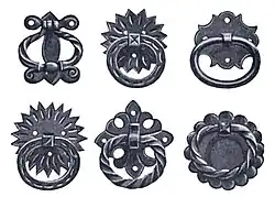 A drawer pull often includes an escutcheon plate to (or through) which the handle is fastened. The handle may swing from one or two mounts ("drop handle" or "swing handle"), a form of bail handle, making a drop drawer pull. The handle may also be permanently fastened to the plate. The plate may be ornamented by piercing, embossing, or engraving, and may receive decorative finishes such as plating, etching, and antiquing. Handle stock may be round, rectangular, or irregular forged shapes.[3]