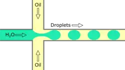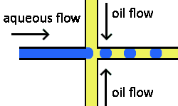 Cross-flowing is a passive formation method that involves the continuous and aqueous phases running at an angle to each other.[9] Most commonly, the channels are perpendicular in a T-shaped junction with the dispersed phase intersecting the continuous phase; other configurations such as a Y-junction are also possible.[8][11][12] The dispersed phase extends into the continuous and is stretched until shear forces break off a droplet.[13][14] In a T-junction, droplet size and formation rate are determined by the flow rate ratio and capillary number.[15] The capillary number relates the viscosity of the continuous phase, the superficial velocity of the continuous phase, and the interfacial tension.[7] Typically, the dispersed phase flow rate is slower than the continuous flow rate. T-junction formation can be further applied by adding additional channels, creating two T-junctions at one location. By adding channels, different dispersed phases can be added at the same point to create alternating droplets of different compositions.[16] Droplet size, usually above 10 μm, is limited by the channel dimensions and often produces droplets with a CV of less than 2% with a rate of up to 7 kHz.