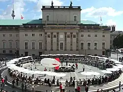 The nine-hour discussion, named The Table of Free Voices and overseen by German Foreign Minister Frank-Walter Steinmeier, used a large round table on the Bebelplatz in Berlin. 112 international artists, philosophers, scientists and human rights activists were invited to simultaneously answer 100 selected questions, recorded by 112 cameras and microphones.[3] The questions had been collected on the organization's website beginning in September 2005. The questions were read out loud by moderators Hafsat Abiola and Willem Dafoe.[4] Prominent participants included Cornel West, Bianca Jagger, Hans-Peter Dürr, John Gage, Bill Joy, Harry Wu and Wim Wenders.