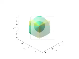 Since the Drucker–Prager yield surface is a smooth version of the Mohr–Coulomb yield surface, it is often expressed in terms of the cohesion () and the angle of internal friction () that are used to describe the Mohr–Coulomb yield surface.[2] If we assume that the Drucker–Prager yield surface circumscribes the Mohr–Coulomb yield surface then the expressions for and are