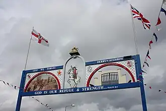 Portadown has long been mainly Protestant and unionist. At the height of the conflict in the 1990s, about 70% of the population were from a Protestant background and 30% from a Catholic background. The town's Catholics and Irish nationalists, as in the rest of Northern Ireland, had long suffered discrimination, especially in employment.[6] Throughout the 20th century, the police—Royal Ulster Constabulary (RUC)—was also almost wholly Protestant.[6] Each summer the town centre is bedecked with loyalist flags and symbols.[7] A loyalist arch is raised over the Garvaghy Road at the Corcrain River,[5] just inside the Catholic district. This is to coincide with the "marching season", when numerous Protestant and loyalist marches are held in the town.