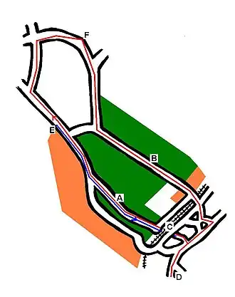Blue line: Route taken on 12 July; from Corcrain Hall (E) along Obins Street (A) and under the railway bridge (C).