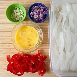 Substitutions for some base ingredients can be made and the dish can be easily made vegetarian or vegan. Fish sauce can be substituted for Thai thin soy sauce. The meat or seafood can be replaced with tofu or vegetables such as cabbage, carrots, broccoli, snow peas, or bell peppers.[6] Broad rice noodles may be substituted for fresh chewy rice noodles or even regular pad Thai noodles. Some can be served without noodles and instead serve the vegetables and protein stir-fry with rice. Other variations include the dish using instant noodles, or a fusion version using spaghetti instead of rice noodles.