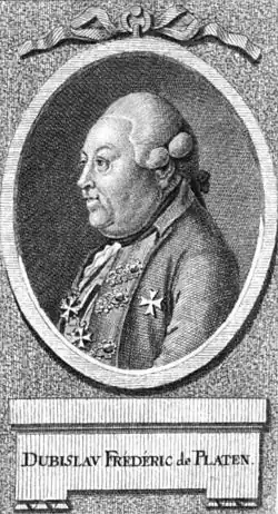 Dubislav Friedrich von Platen (23 August 1714 – 7 June 1787) was a Prussian officer in Frederick the Great's army. A cavalry general, he was also Governor of Königsberg, a Knight of the Order of Saint John, and a recipient of the Order of the Black Eagle. An active cavalry officer in all of the wars fought by Frederick—the War of Austrian Succession, the Second Silesian War, the Seven Years' War and, finally, the War of Bavarian Succession — he was commemorated on Equestrian statue of Frederick the Great in 1851 erected by Frederick's great-great nephew, Frederick William IV.