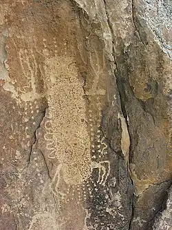 The first occupants of the mountains and valleys surrounding what is now Dubois were members of the Sheepeaters, a group of Mountain Shoshone, who included the Wind River area in their regular annual migrations from the Great Plains through the mountains of Yellowstone and beyond.[9] The Wind River Valley surrounding Dubois contains numerous remnants of these people who lived in the area for many hundreds of years before they were relocated into a nearby reservation.[9][10] Relics of their existence in the mountains and valleys around Dubois include numerous prehistoric petroglyphs, hunting traps and blinds, and stone tepee circles.