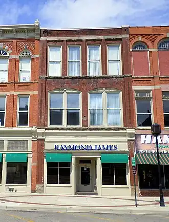 The Duff Building is a three-story, four-bay building measuring twenty-two feet by eighty-five feet. It is constructed of red brick. The facade is designed in an Italianate style, with one storefront containing a recessed doorway, wide windows with kick panels below, and brick side piers. The second floor contains two paired, one-over-one, double hung sash windows set in bowed-arch brick openings. The third floor level, contains four symmetrically placed one-over-one, double hung sash windows.[2]