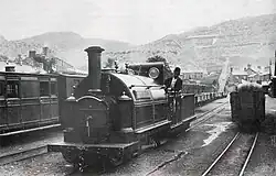 Both stations' platform was almost nominal, as the carriages were very low to the ground no height was needed.[11][12] There were two running lines through the station: the "Passenger Line" which ran past the platform, with the other for goods and workmen's trains.[13] The other two lines visible on photographs were a run-round loop for passenger locomotives and a siding.