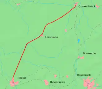 The railway ran from Duisburg via Oberhausen West, Bottrop Nord, Dorsten, Coesfeld, Steinfurt and Rheine to Quakenbrück where it connected with the network of the Grand Duchy of Oldenburg State Railways.