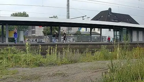 Duisburg-Großenbaum station is a station in the district of Großenbaum of the city of Duisburg in the German state of North Rhine-Westphalia. It is on the Cologne–Duisburg railway and it is classified by Deutsche Bahn as a category 5 station.[2] The station was opened on 9 February 1846 as Großenbaum. It was renamed Duisburg-Großenbaum on 14 May 1950. A station building was built in 1856, but it is now used as a cafe, called Gleis drei (track three).[5]