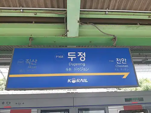 - ^ a b 두정역 (in Korean). KRIC. Retrieved 2015-12-22.