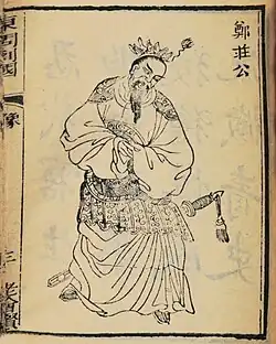 Duke Zhuang of Zheng (Chinese: 鄭莊公; 757–701 BC) was the third ruler of the State of Zheng during the Spring and Autumn period in ancient China. His ancestral name was Ji (姬), given name Wusheng (寤生), which means "difficult birth" with breech presentation.[1][a] In 743 BC, he became the duke of Zheng, and later defeated his younger brother Gongshu, who had led a rebellion against him. Duke Zhuang led military campaigns in the name of the Zhou king against the Rong people and other Zhou states.