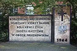 After the war, 82 unknown Warsaw insurgents and 50 civilians (including 23 women and 8 children) were exhumed from the graves on the camp's territory and transferred to the cemetery in Pruszków on 27 April 1945.[115] From an imitative list compiled by Polish Red Cross employees, it follows that by November 1944 1,559 refugees from Warsaw were interred in suburban cemeteries.[116] It is known that 512 people from Dulag 121, who died between 16 August 1944 and 17 March 1945, rest in the cemetery in Tworki. In the cemetery in Gołąbki in Ursus, there are graves of 70 known individuals and 40 unknown Warsaw residents. In Milanówek, 295 people who died between September 1944 and July 1945 are interred.[117] In turn, the remains of 34 refugees (these are people who died between 5 September and 30 November 1944, including Aleksander Janowski, one of the founders of the Polish Tourist Society) are buried in the cemetery in Komorowo. These are not all burial places for expelled and deceased Warsaw residents. The number of Dulag 121 prisoners who died from diseases or exhaustion may therefore reach several thousand.[110]
