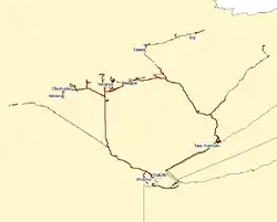 ![]() Map of the DM&IR. Solid lines are track still in use; dotted lines are abandoned track. | |