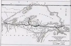 The Duluth, South Shore and Atlantic Railway (DSS&A; reporting mark DSA) was an American railroad serving the Upper Peninsula of Michigan and the Lake Superior shoreline of Wisconsin. It provided service from Sault Ste. Marie, Michigan, and St. Ignace, Michigan, westward through Marquette, Michigan, to Superior, Wisconsin, and Duluth, Minnesota. A branchline stretched northward from Nestoria, Michigan, up to the Keweenaw Peninsula and terminating at Houghton, Michigan, with two branches extending further to Calumet, Michigan, and Lake Linden, Michigan.[1]