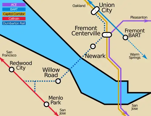 In August 2018, SamTrans partnered with Cross Bay Transit Partners (CBTP), a limited liability corporation formed by Facebook and the Plenary Group, to perform full environmental impact analyses and a fiscal impact analysis for the project or explore possible alternatives.[73] The public-private partnership began an environmental review process in 2019.[74] Four public meetings were held in February and March 2019 to publicize the partnership's efforts and to gather input on the proposed concepts.[75] On the Peninsula, three rail stations have been proposed: the western terminus at the existing Redwood City station, Marsh station (in North Fair Oaks, near the intersection of Spring/15th and Bay/Florence), and Willow station (near Facebook headquarters, close to Willow Road and CA-84); in the East Bay, the proposed station is Newark with potential extensions to Union City (at the existing BART station) via Fremont-Centerville and a spur line to Ardenwood (near CA-84 and Ardenwood Road).[76]