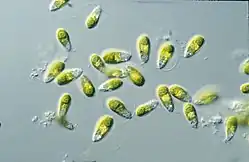 Dunaliella is a single-celled, photosynthetic green alga, that is characteristic for its ability to outcompete other organisms and thrive in hypersaline environments.[1] It is mostly a marine organism, though there are a few freshwater species that tend to be more rare.[2] It is a genus in which certain species can accumulate relatively large amounts of β-carotenoids and glycerol in very harsh growth conditions consisting of high light intensities, high salt concentrations, and limited oxygen and nitrogen levels, yet is still very abundant in lakes and lagoons all around the world.