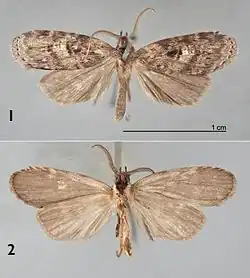 The length of the forewings is 11.2–12.2 mm. The forewing dorsal ground color is a mixture of gray-brown, reddish-brown, and beige-colored scales. The veins are lined with gray, especially distally. The anal fold and cubitus are reddish brown and the orbicular spot is diffuse reddish brown. The reniform spot is small and reddish brown. The ventral surfaces of both wings are gray brown. The dorsal hindwing is dirty gray brown, but lighter near the base.