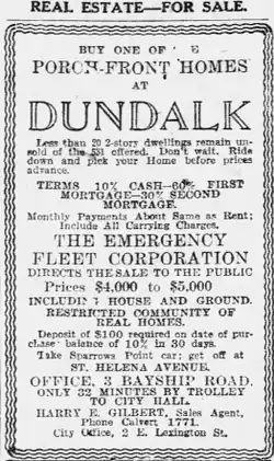 Prior to the passage of the Fair Housing Act of 1968, racial covenants were used in Maryland to exclude African-Americans and other minorities. A 1920 advertisement in the Baltimore Sun advertised houses in Dundalk as racially "restricted".[6]