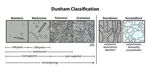 2. ^ a b c d e Dunham, R.J. (1962) Classification of carbonate rocks according to depositional texture. In: Classification of Carbonate Rocks (Ed. W.E. Ham), Am. Assoc. Pet. Geol. Mem., 1, 108–121.