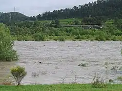 Between 1832 and 1890, the Durance had 188 floods of more than 3 metres (10 ft) (measured at the Mirabeau Bridge).[17] The flood of 1843 carried away several newly built suspension bridges: the 1829 bridge at Remollon, the 1835 bridge at Mirabeau, the unfinished bridge at Manosque and the 1838 bridge at Les Mées. The flood of 1872 also swept away the 1847 bridge at Mallemort.[18]