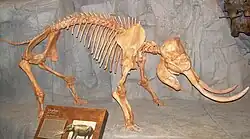Skeletal restoration of the pygmy mammoth (Mammuthus exilis) showing size compared to a human