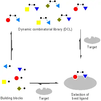 Dynamic combinatorial chemistry (DCC); also known as constitutional dynamic chemistry (CDC) is a method for the generation of new molecules formed by reversible reaction of simple building blocks under thermodynamic control.[3][4] The library of these reversibly interconverting building blocks is called a dynamic combinatorial library (DCL).[5][6] All constituents in a DCL are in equilibrium, and their distribution is determined by their thermodynamic stability within the DCL. The interconversion of these building blocks may involve covalent or non-covalent interactions. When a DCL is exposed to an external influence (such as proteins or nucleic acids), the equilibrium shifts and those components that interact with the external influence are stabilised and amplified, allowing more of the active compound to be formed.