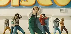 The music video for "Dynamite" was preceded by a 28-second long video teaser which was published to Big Hit's official YouTube channel on August 18.[66] The short clip showed scenes of the band in pastel-colored clothes with a sunset sky behind them, as well as them dancing to a "cheerful disco melody" in retro-styled outfits against the backdrop of a large "Disco" sign.[66] The audio featured a "funky bass line and horns" and showcased the song's "upbeat" and "boundless" energy.[19]