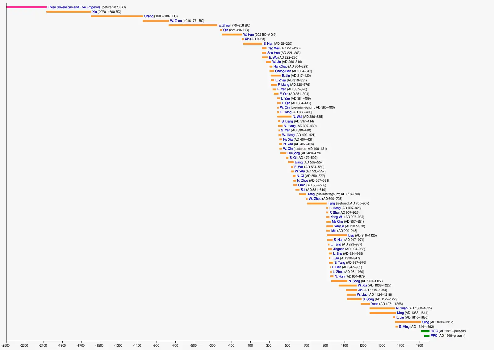 Traditionally, as most Chinese historiographical sources uphold the idea of unilineal dynastic succession, only one dynasty could be considered orthodox at any given time.[70] Most historical sources consider the legitimate line of succession to be as follows:[70]