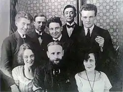 Belgian artists at the home of Victor Servranckx (June 1922); from left to right: (top) René Magritte, E.L.T. Mesens, Victor Servranckx, Pierre-Louis Flouquet, Pierre Bourgeois; (bottom) Georgette Berger, Pierre Broodcoorens, Henriette Flouquet