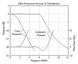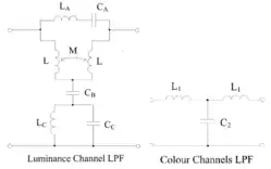 The EMI 2001 used band defining filters in all four channels. For the colour channels and narrow-band luminance, the low-pass filters had a Gaussian shaped pass-band[12] and, although such filters were not 'sharp-cut', they were linear phase and gave negligible overshoots on transients. The wide-band luminance channel had its bandwidth defined by a linear phase low pass filter with a 3 dB cut-off at 6.8 MHz. Its design follows the lattice filter methods of Bode.[13]