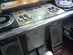 EZ2DJ's cabinet features a total of 10 speakers. There are four mid-range speakers stacked vertically on either side of the screen, and two subwoofers located on the front of the machine. The cabinet also features a pair of headphone jacks, giving players the options to use their own headphones. Using headphones does not disable the external speakers.